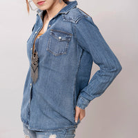 LC-ADSH025 Women's Mid-Wash Western Denim Shirt with High-Detail Hand-Tooled Leather Yoke
